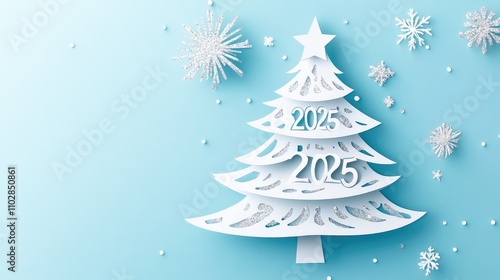 Festive Paper Cut Christmas Tree with 2025 Design and Snowflakes on Light Blue Background for Holiday Celebrations and Seasonal Decor