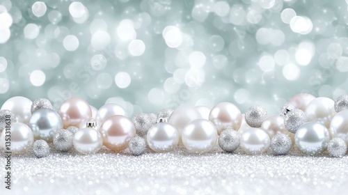 Festive Pearl Silver Christmas Ornaments Sparkling Bokeh Background