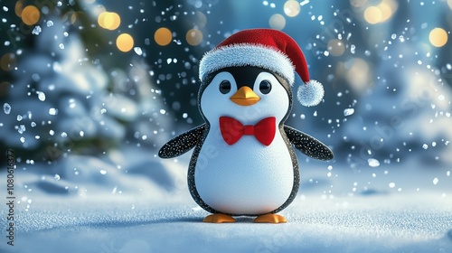 Festive Penguin Wearing Santa Hat in Snowy Winter Wonderland