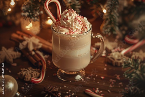 festive, peppermint, chocolate, whipped, cream, holiday, drink, mug, candy, cosy, warm, winter, christmas, decoration, lighting, cinnamon, star, sprinkle, pine, snowflake, gingerbread, seasonal, dessert, homemade, comforting, sweet, indulgent, treat, rustic, cheerful, beverage, creamy, ornamental, celebration, traditional, caffeine, sugar, spice, elegant, leisure, relaxation, warmth