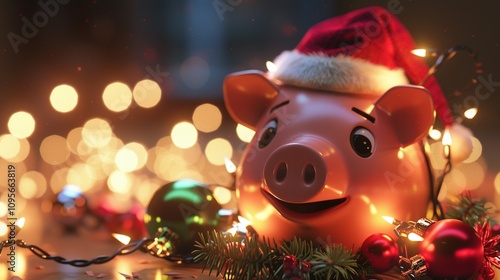 baby pig, bank, christmas, savings, festive, light, ornament, decoration, santa, hat, red, green, gold, bokeh, sparkle, jolly, cheerful, happy, winter, holiday, season, celebration, present, gift, money, finance, budget, year, end, new, goal, planning, christmas, december, twinkle, glow, bright, warm, cosy, magical, spirit, joy