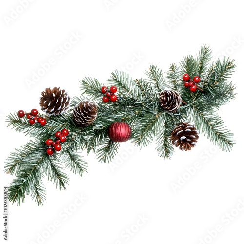 Festive pine branch with pinecones and red ornaments for christmas decor