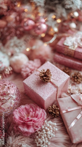 Festive pink decorations adorn the scene, featuring wrapped gifts, ornaments, and natural elements, creating a delightful and cozy holiday atmosphere perfect for celebrations.