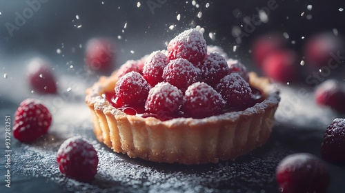 dessert, pastry, food, cake, raspberry, berry, sweet, homemade, baking, confectionery, cookery, epicure, delicious, indulgence, temptation, treat, snack, sugar, cream, dusting, powdered, festive, holiday, winter, season, cosy, comfort, freeze, frost, sparkle, glistering, deliciously, tart, pie, flaky, crust, decadent, rich, tasty, delightful