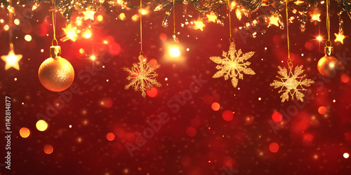 Festive Red Christmas Background with Golden Lights and Decorations