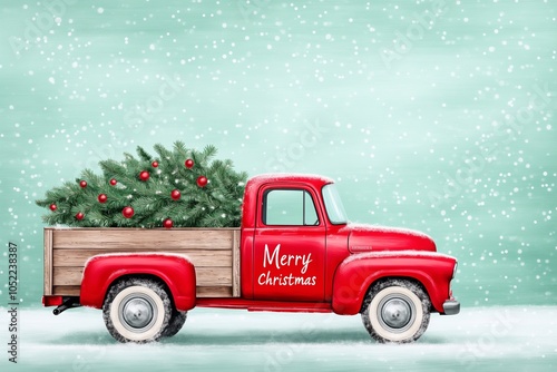 Festive red Vintage Pickup with Christmas Decor. Generative ai