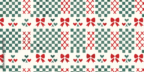 pattern, christmas, holiday, red, green, white, heart, bow, chequered, square, geometric, repeating, design, decor, texture, festive, traditional, vintage, retro, fabric, wallpaper, background, seamless, illustration, artwork, style, flat, vector, winter, celebration, ornament, surface, motif