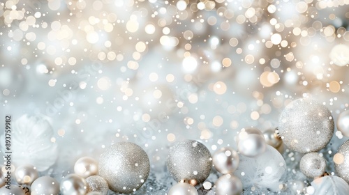 Festive silver and gold Christmas ornaments with sparkling bokeh lights, creating a magical holiday backdrop of glitter and shine.