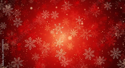 Festive snowflake blizzard on scarlet backdrop for seasonal celebration