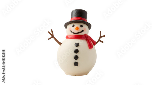 Festive snowman figurine with red scarf and black top hat isolated on the transparent background, cute winter holiday decoration