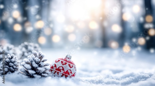 snow, winter, forest, pine, cone, ornament, red, festive, holiday, scene, nature, outdoors, decoration, beauty, branch, frost, sparkle, bokeh, celebration, seasonal, cold, white, cheerful, peaceful, christmas, joy, calmness, landscape, environment, freeze, warmth, cheer, spirit, tradition, family, time, new, year, joyfulness, gathering, wonderland, scenery, calm, atmospheric, holiday, snowy