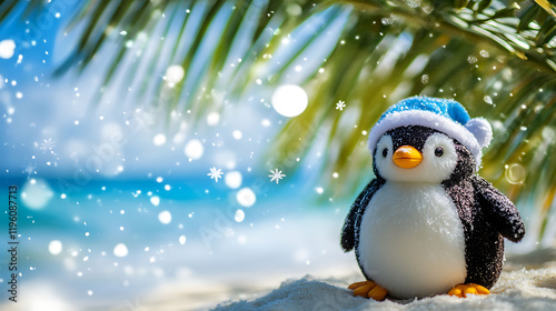 Festive stuffed penguin under palm tree with snowflakes falling on the beach