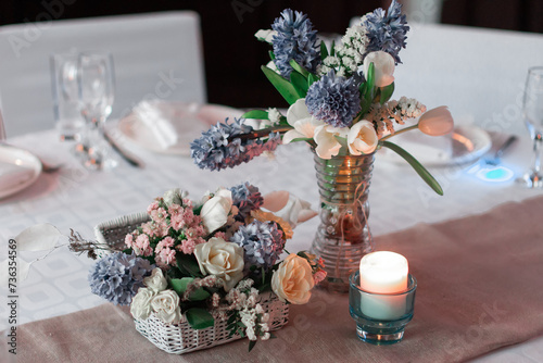 Festive table decoration with flowers and other elements