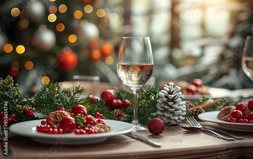 table, christmas, decor, holiday, festive, dinner, celebration, food, wine, glasses, red, white, gold, pine, tree, ornament, background, light, sparkle, plate, cutlery, setting, traditional, cheerful, family, together, joy, warm, cosy, happy, season, cheer, winter, december, new year, eve, gathering, party, friends, love, gift, magical, elegant, luxury, classic