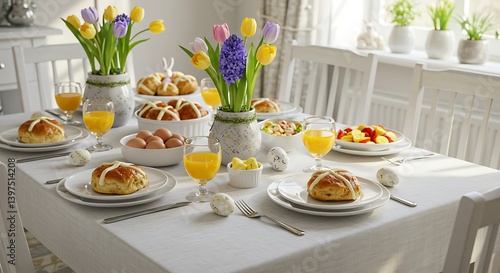 Festive Table Setting with Easter Buns, Juice, and Flowers