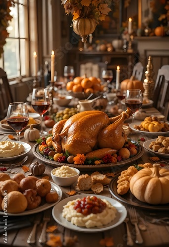 Festive Thanksgiving Feast – Roasted Turkey and Classic Holiday Dinner Table. Appetizers