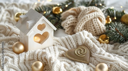 Festive toy house with heart cutout, fir wreath, golden baubles, and warm garland on a cozy white knit blanket