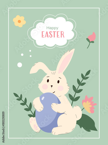 Festive vertical card with a cute rabbit character, spring flowers, and Happy Easter text in a cloud. Kids spring illustration for seasonal greetings