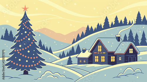 Festive winter landscape with a village in the background and festive SVG, Christmas tree in the foreground SVG. Illustration can be used as a Christmas holiday card AI, Day, EPS, PNG, JPEG File.