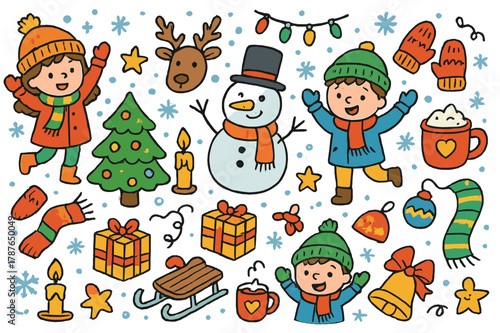 Festive Winter Wonderland. snowy celebration. Colorful Hand-drawn doodle Children illustration snowy celebration snowman, Christmas tree, gifts, candle,