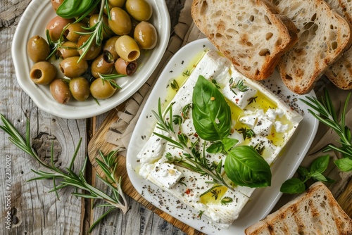 cheese, feta, view, top, turkish, rustic, food, summer, leaf, white, bread, oil, old, olive, board, cookery, snack, wooden, herb, mediterranean, spice, seasoning, dairy, basil, fork, greek, goat, thyme, rosemary, oregano, silverware, slice, starter, up high, closeup, cut, discolored, eat, fresh, salty, serving, stick