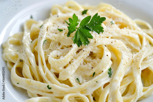 Fettuccine Alfredo with parsley garnish on isolated white background