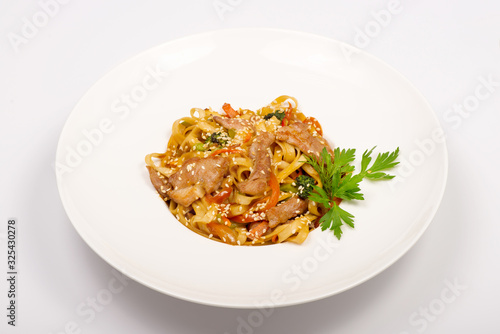 fetuccine pasta with fried chicken, red sweet pepper and sesame seeds in a white plate on a white background
