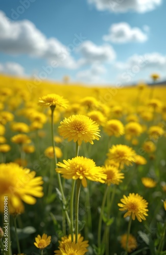 Field of bright yellow helichrysum flowers under a blue sky with fluffy clouds. The blooms gently sway in the wind creating a vibrant natural scene. Perfect for spring or summer themes.