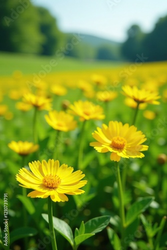 Field of bright yellow Ranunculus acris in a lush green meadow, landscape, flowers