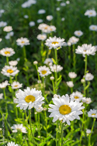 Field of camomiles at sunny day at nature. Camomile daisy flowers, field flowers, chamomile flowers, Summer. Sunshine