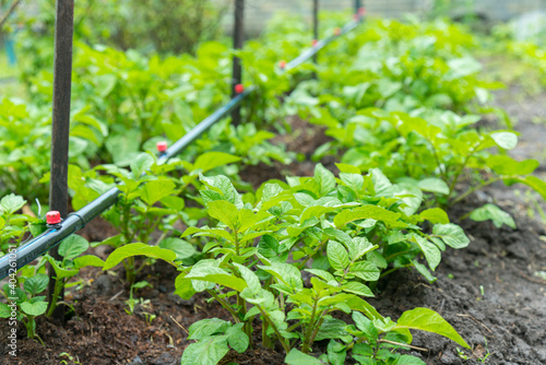 Field of green potato bushes. Rows on Potato field with green bushes. potato bushes in the garden. Automatic watering in a potato field