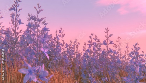 Field of pale blue flowers bathed in a soft pink and orange sunset sky