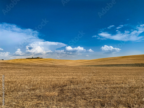 country, cloud, farm, yellow, blue, nature, sky, cloud, agriculture, summer, farming, land, countryside, green, season, tuscany, italy, landscape