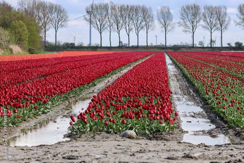 Fields of flowering tulips where flower bulbs are grown on Goeree-Overflakkee attracting dutch tourist