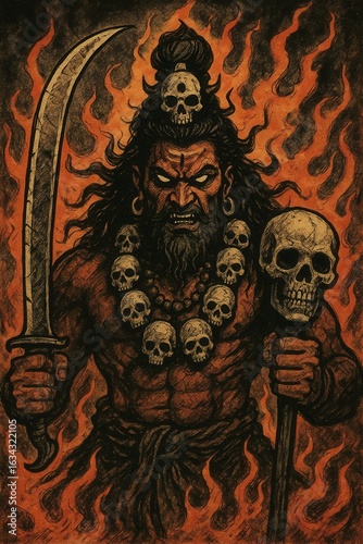 Fierce mystical warrior illustration with skulls and fiery background.