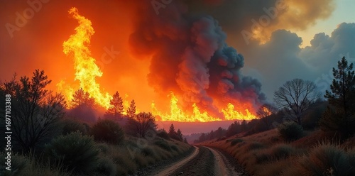 Fierce wildfire raging through a dry forest, consuming trees and shrubs, billowing smoke into the sky The intense flames create a dramatic scene of destruction and nature's power , trees, smoke