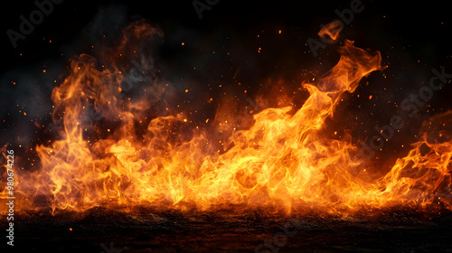Fiery Abstract Background with Intense Blazing Flames and Smoke, Orange and Yellow Fire with Sparks, Burning Embers on a Black Background