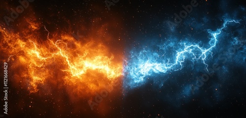 fire, ice, electricity, lightning, clash, energy, power, abstract, digital, art, design, graphic, illustration, concept, contrast, light, dark, bright, spark, glow, texture, dynamic, high-coloured, intense, force, burning, freezing, element, chaos, nature, cosmic, sparkling, swirled