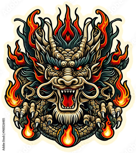 dragon, fantasy, fire, flames, powerful, fierce, majestic, mythical, legend, tattoo, art, illustration, graphic, design, digital artwork, vector, mascot, symbol, folklore, culture, mythology, traditional, ancient, spiritual, mystical