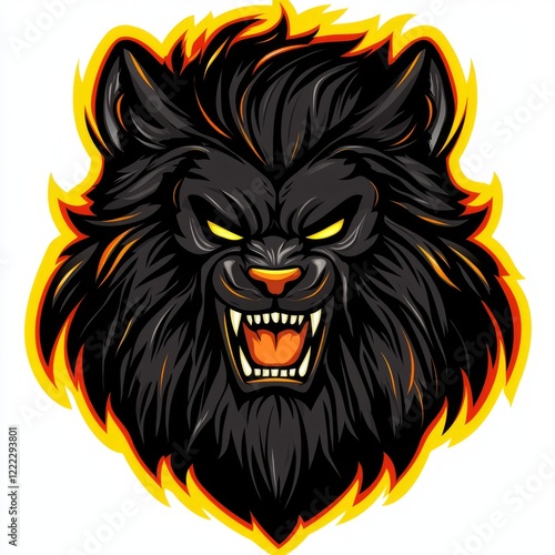 lion, black, head, fire, flames, roaring, intense, aggressive, fierce, powerful, majestic, angry, wrath, fury, mane, teeth, fang, claw, yellow, orange, red, graphic, design, emblem, logotype, symbol, mascot, illustration, art, artwork, style, bold, strong, wild, animal, predator, beast, cartoon, fantasy, mythical