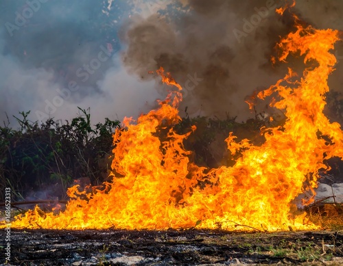 Fiery blaze engulfing dry brush