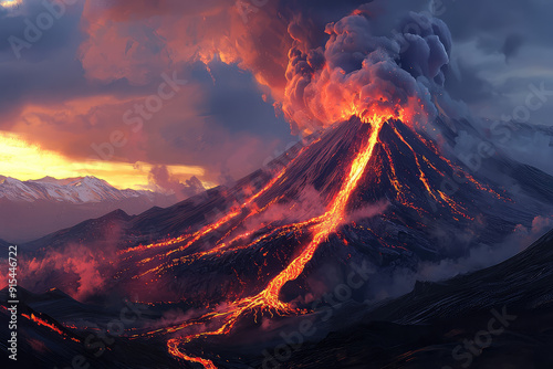Fiery Display: A Mesmerizing Volcanic Eruption Bathed in Sunset Hues