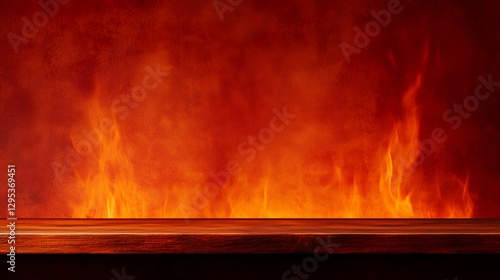 Fiery Flames Against Dark Red Background With Wooden Tabletop