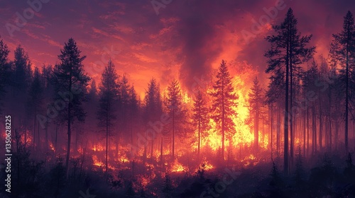 Fiery forest ablaze with intense flames and smoke at dusk