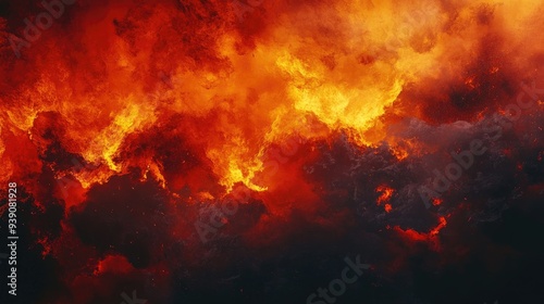 Fiery Halloween background with lava explosions, orange-red inferno, and black smoke, creating an intense atmosphere with space for text.