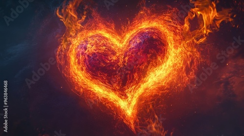 Fiery heart in dark sky, burning passion