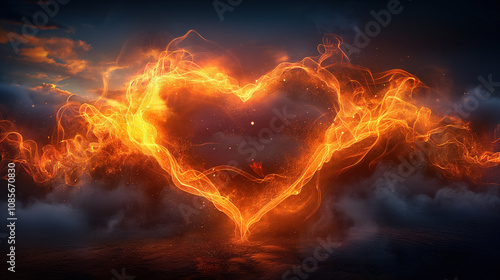 Fiery heart in glowing sky: passionate flames and dramatic cloudscape