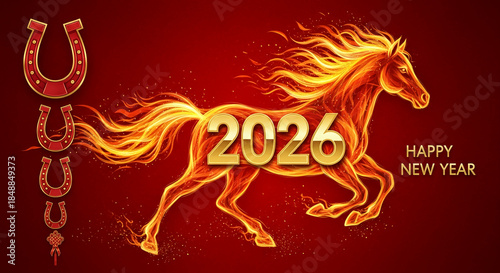 Fiery horse image, golden year 2026, "Happy New Year" text. Red horseshoe. Representing Chinese New Year, new beginning and good fortune.