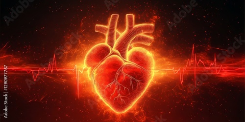 Fiery Human Heart Anatomically Accurate Illustration with Heartbeat Graph, Vibrant Colors