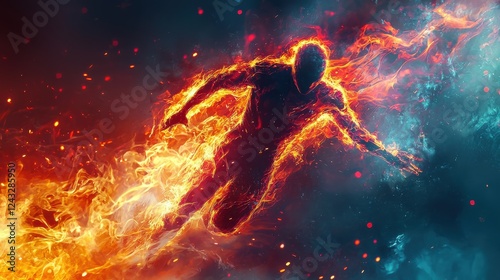 Fiery humanoid figure engulfed in flames against a dark, cosmic background with sparks and contrasting cool blue hues. Abstract and powerful imagery.